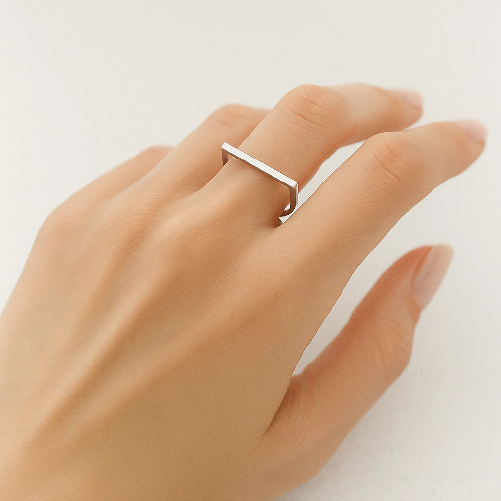 Diseño moderno y ultra liviano con una barra horizontal como protagonista. Una pieza sutil que combina elegancia y simplicidad, ideal para usar sola o acompañar con otros anillos finos.