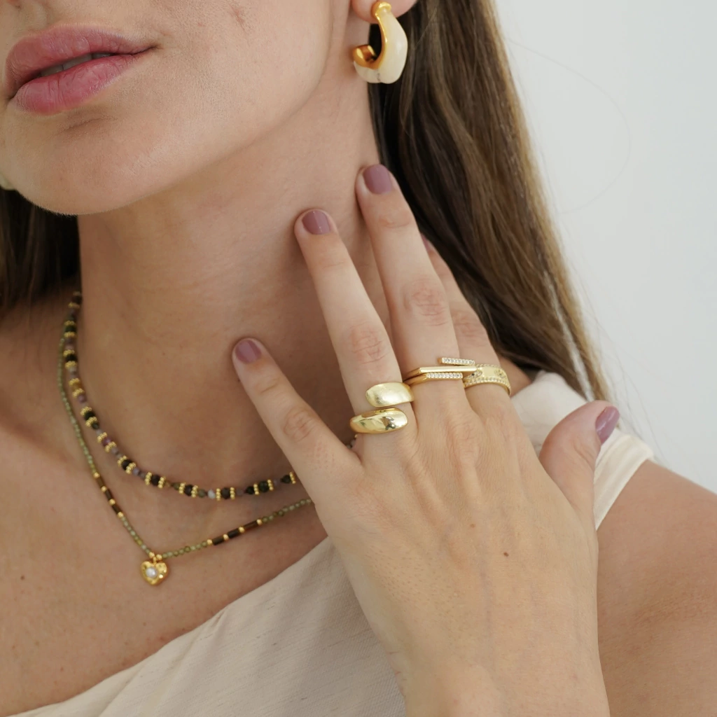 El Anillo Dual Gold combina textura y brillo en un diseño contemporáneo que transmite equilibrio y estilo. Su forma abierta, levemente regulable, permite un calce cómodo y versátil. Un lado presenta un acabado pulido espejo y el otro un mate satinado, creando un contraste sutil pero lleno de carácter. Una pieza moderna, femenina y distintiva, parte de la cápsula exclusiva Barbie Simons (BS Edition).