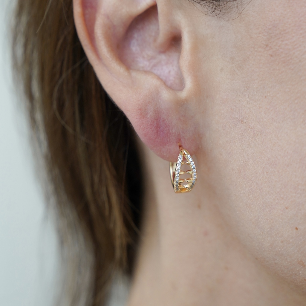 Estas argollas doradas de tamaño pequeño a mediano combinan el brillo clásico de las circonias con un diseño moderno y estructural. Con un diámetro externo de aproximadamente 1,5 cm, son lo suficientemente sutiles para el uso diario, pero con detalles que las hacen destacar.