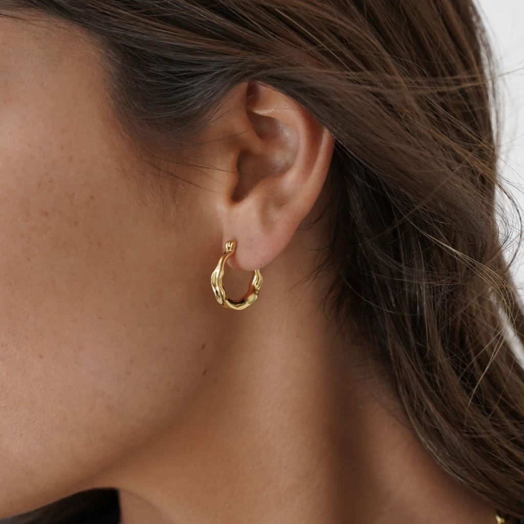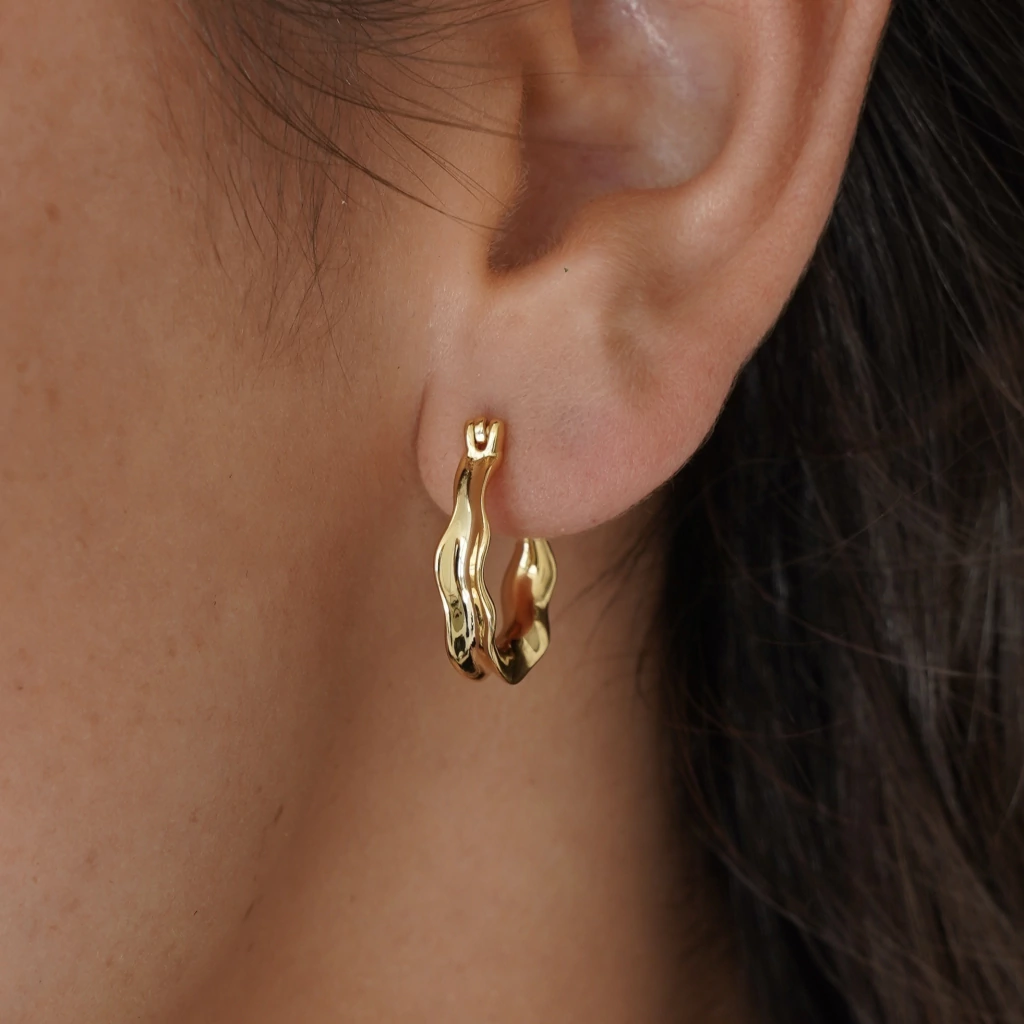 Confeccionadas en aleación metálica de alta calidad y chapadas en oro de 18k, estas argollas presentan un acabado dorado cálido, brillante y pulido, que realza su volumen y permite que la luz juegue sobre sus ondulaciones con un efecto sutil y refinado.