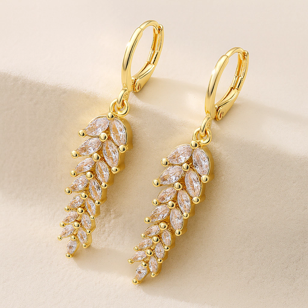 Estos aros de fiesta combinan brillo, delicadeza y un diseño súper femenino. La argolla dorada sostiene una cascada de hojitas con cristales corte marquise que reflejan la luz desde cada ángulo, creando un efecto luminoso y muy sofisticado. Livianos, elegantes y perfectos para elevar cualquier look nocturno o de evento.