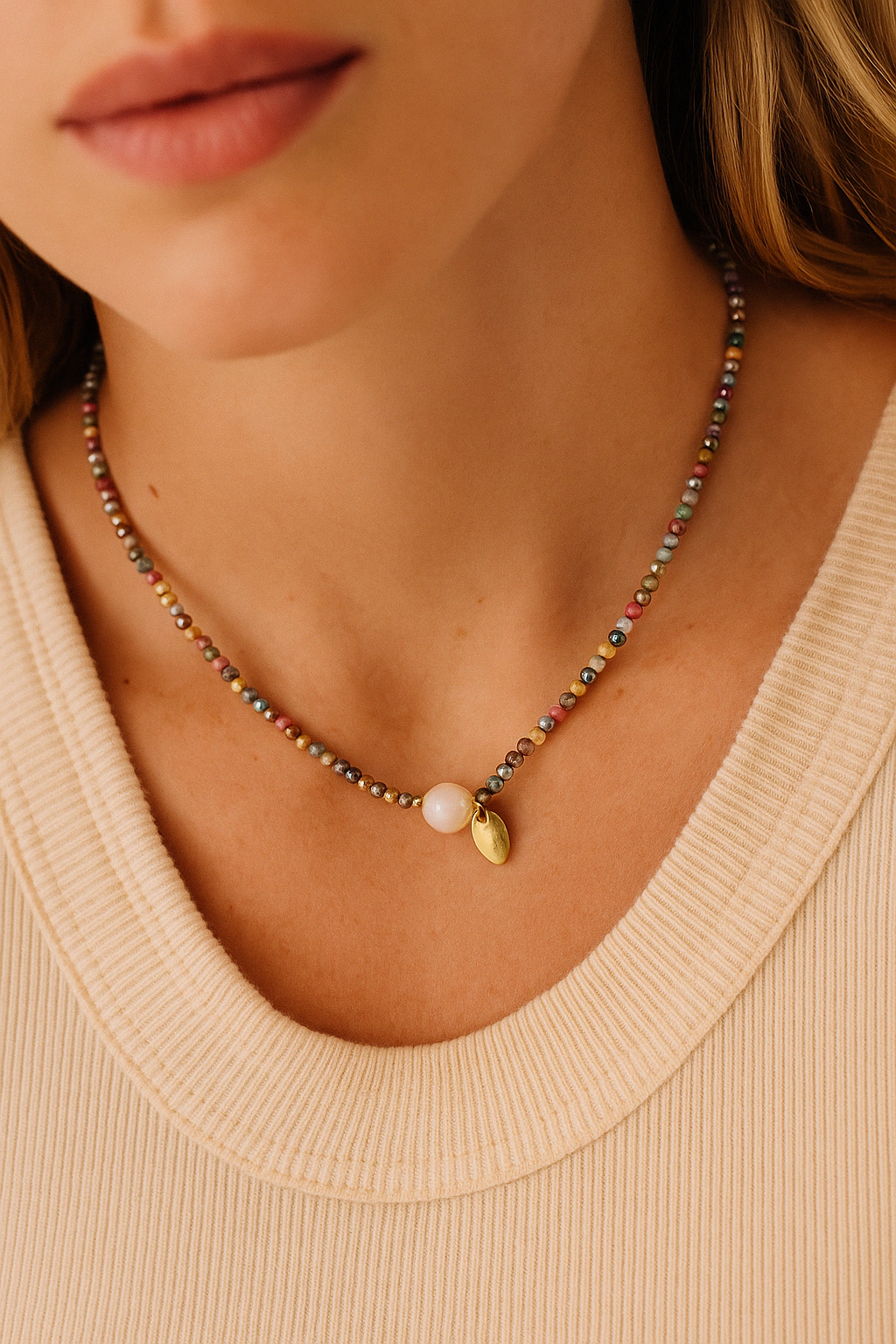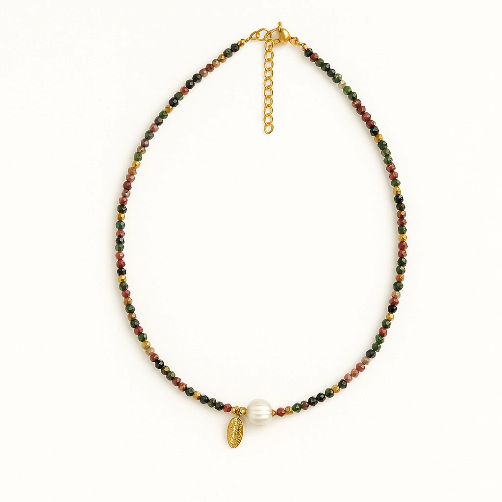 El Collar Duna Pearl Multicolor combina elegancia natural y un encanto artesanal único. Está confeccionado con cuentas de vidrio facetadas en tonos tierra, verdes, rosados y mostaza, que se entrelazan con una perla natural de río en el centro. Su brillo sutil y su diseño equilibrado lo convierten en una pieza versátil y sofisticada, ideal para elevar cualquier look con un toque de color y distinción.