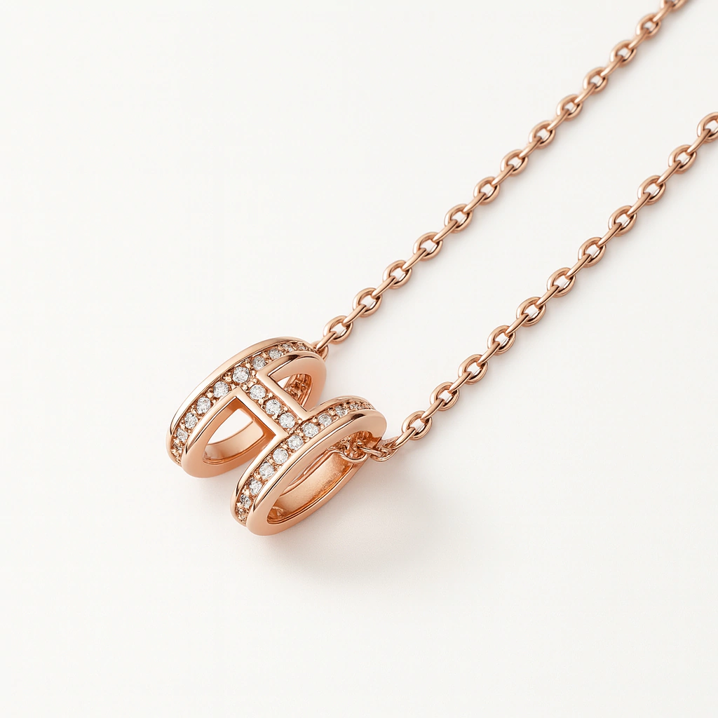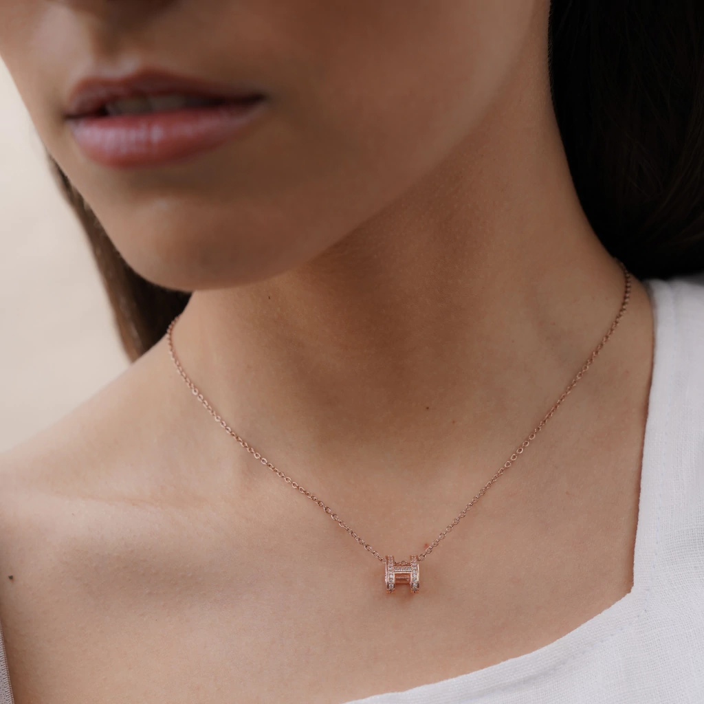 Collar delicado con dije en forma de letra H, embellecido con cristales brillantes que aportan un toque elegante y personal. Confeccionado en acero con baño de oro rosado, es una pieza ideal para regalar o para lucir como accesorio distintivo en el día a día.