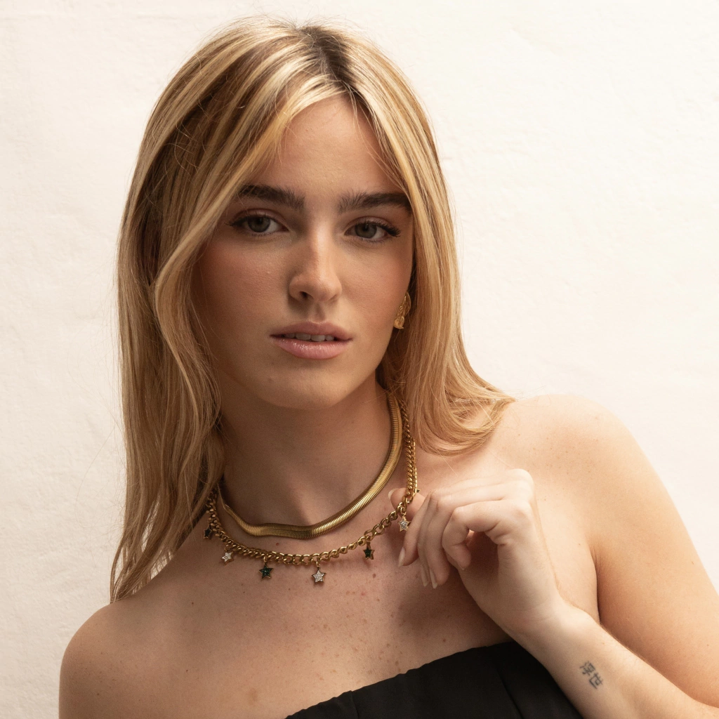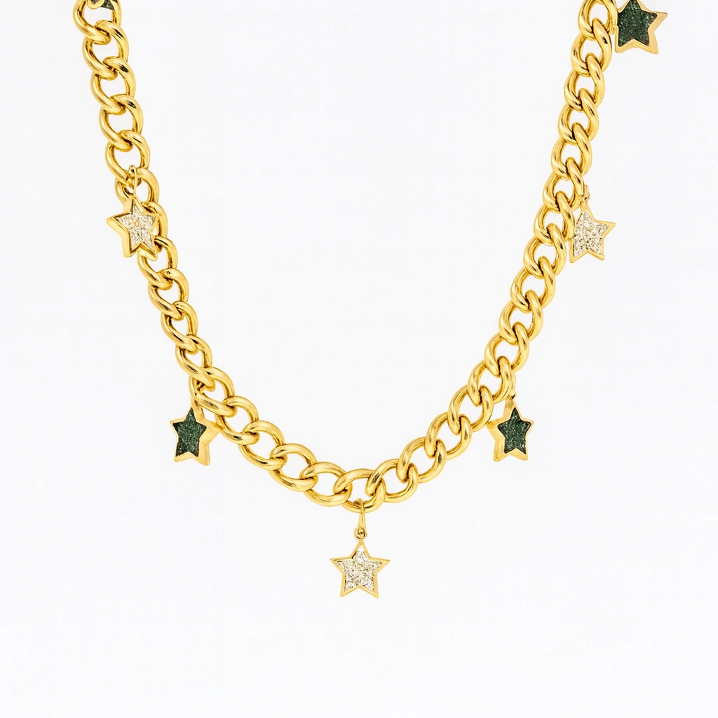 Descubre la magia del collar dorado con estrellas en colores, un accesorio que transforma tu estilo con un toque de brillo y elegancia. Este collar, elaborado en aleación de metales enchapado dorado, es perfecto para realzar cualquier atuendo, ya sea para el día a día o una ocasión especial.