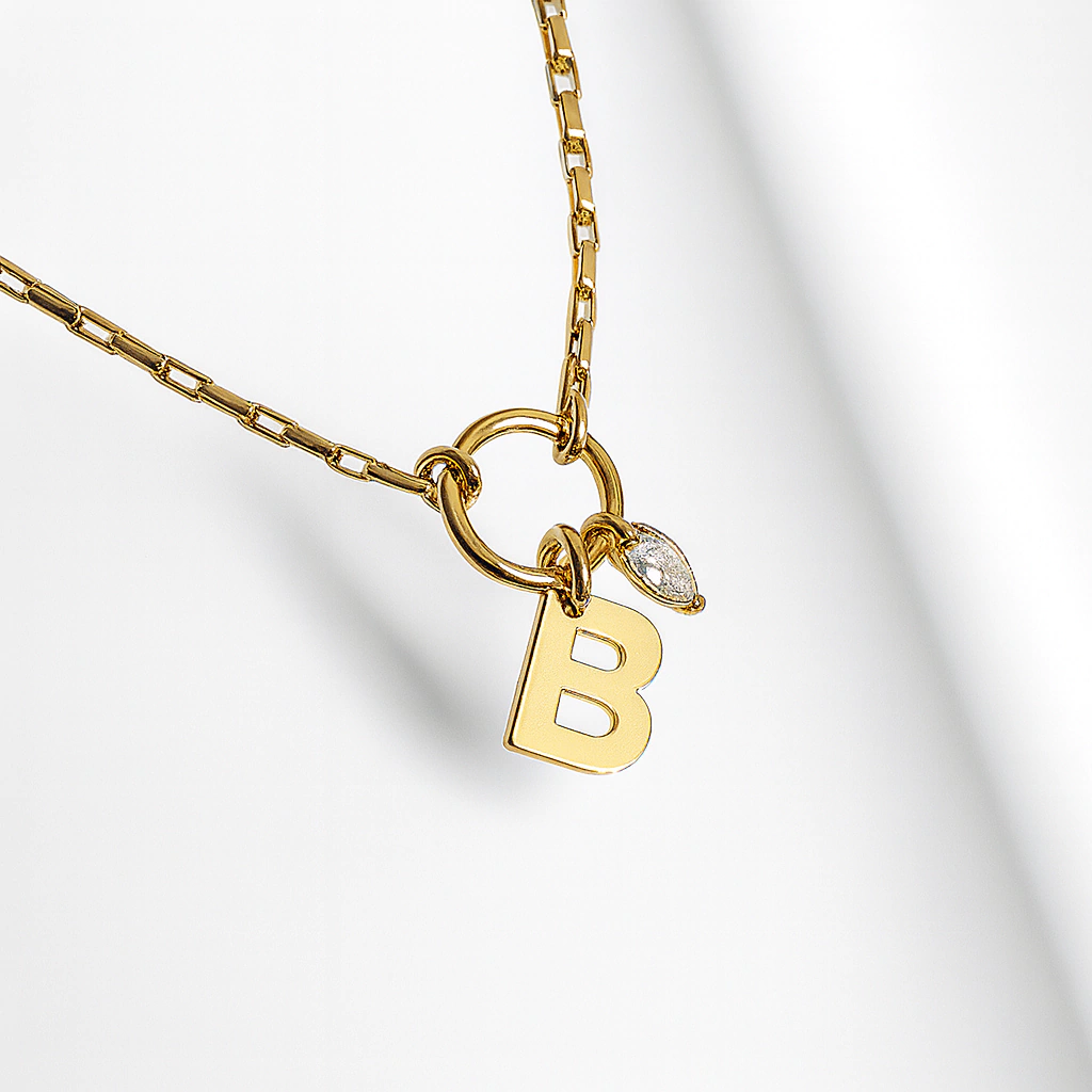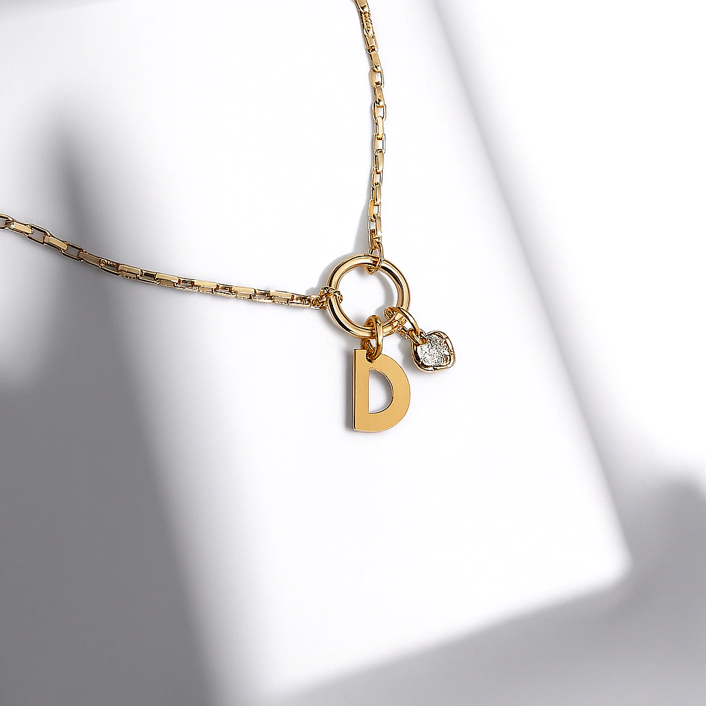 Características destacadas: - Base de aleación de metales: Asegura durabilidad y resistencia. - Baño reforzado en oro 18k: Un acabado lujoso que brilla con cada movimiento. - Argolla central con dijes: Incluye un cubic y un dije en forma de letra, aportando un toque personalizado a tu look.