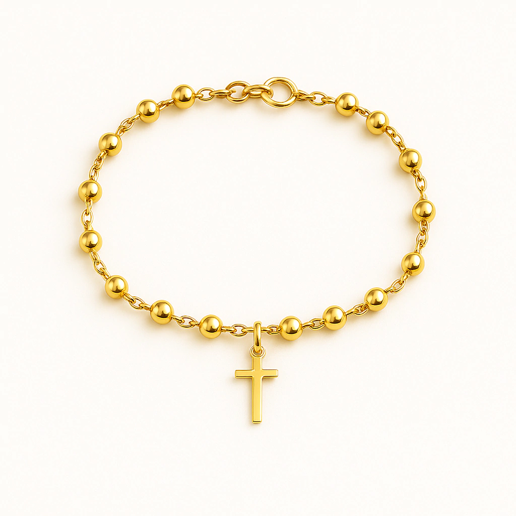 Delicada y femenina, esta pulsera está elaborada en acero enchapado en oro 18k, con un diseño de bolitas intercaladas y un dije de cruz que aporta un toque distintivo y elegante. Su estilo clásico y atemporal la convierte en un accesorio versátil, perfecto para uso diario o para ocasiones especiales.