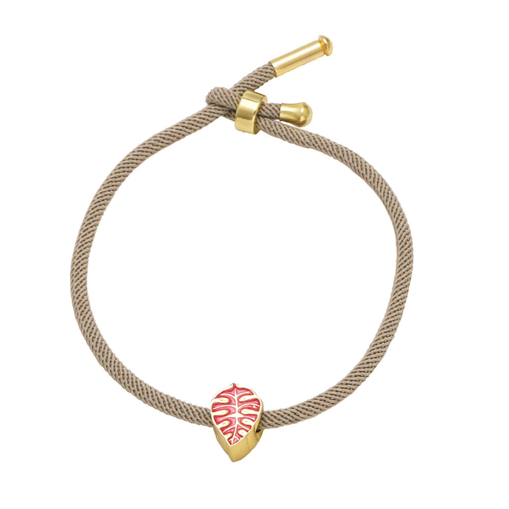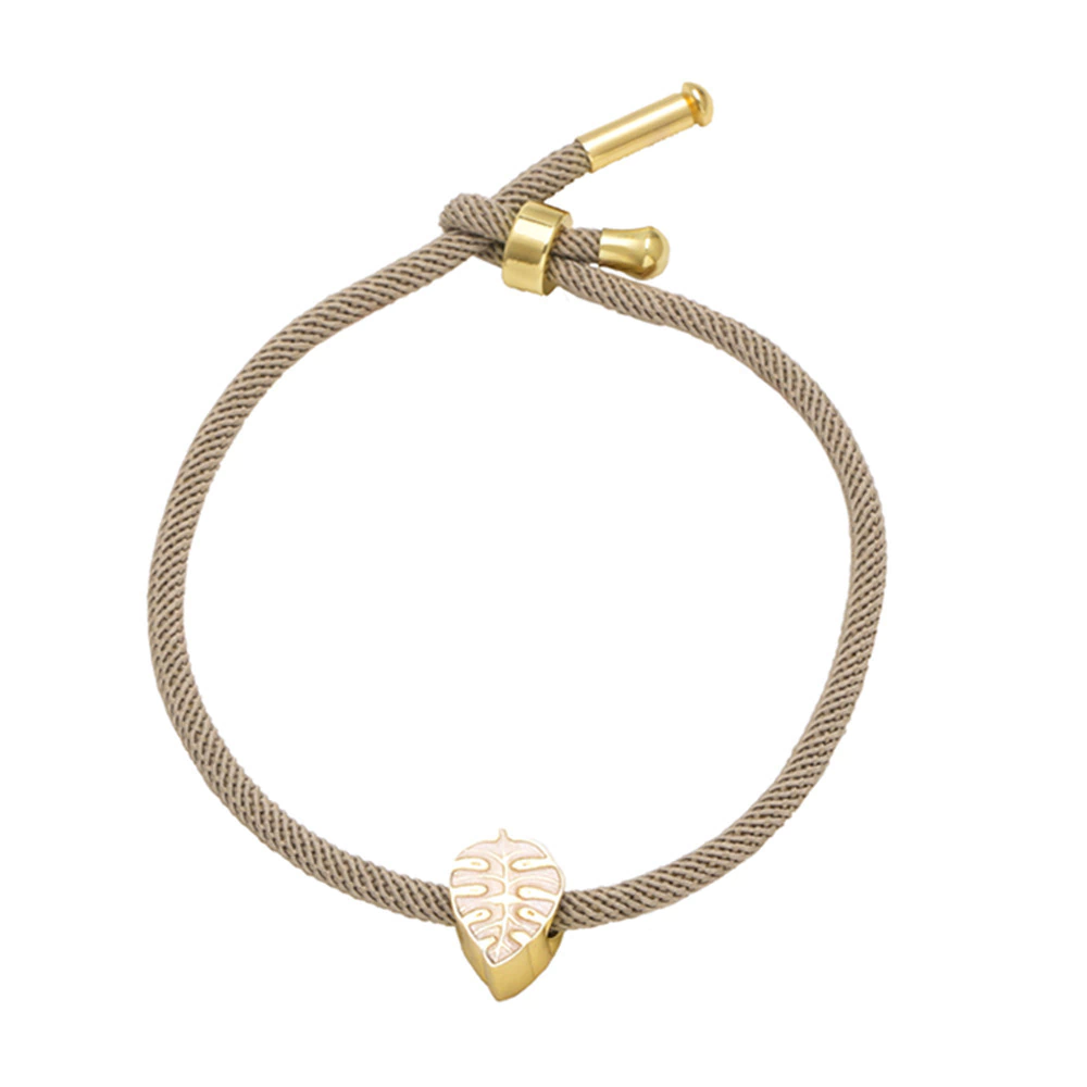 Una pieza delicada y encantadora. Esta pulsera ajustable combina un cordón importado en tono arena con un dije en forma de hoja tropical, enchapado en oro y esmaltado a color. El equilibrio perfecto entre frescura natural y elegancia sutil.